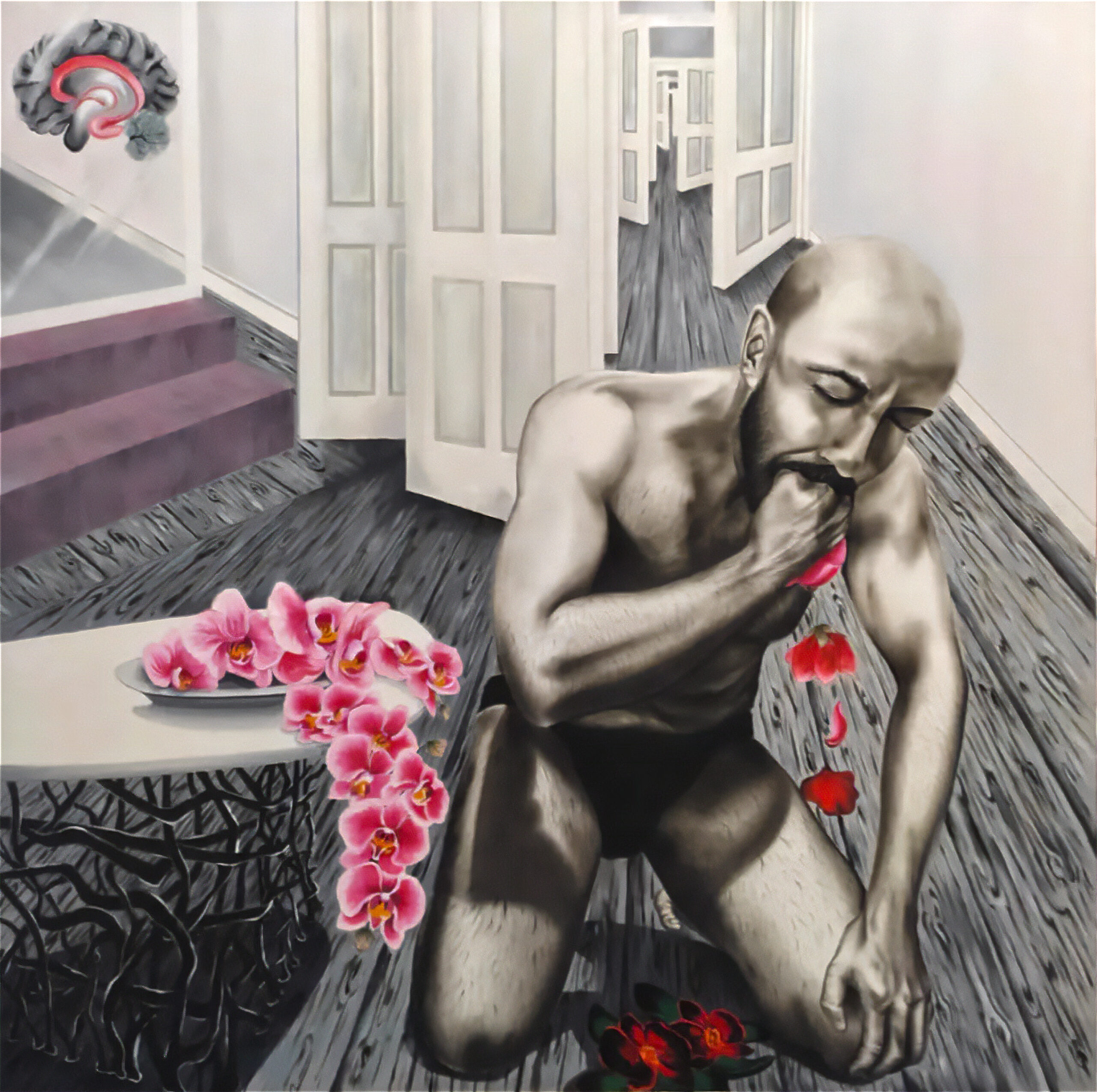 Del cerebro destaca, pintado en el mismo color que las orquídeas, el sistema límbico, la parte implicada en las emociones, el hambre y la sexualidad.