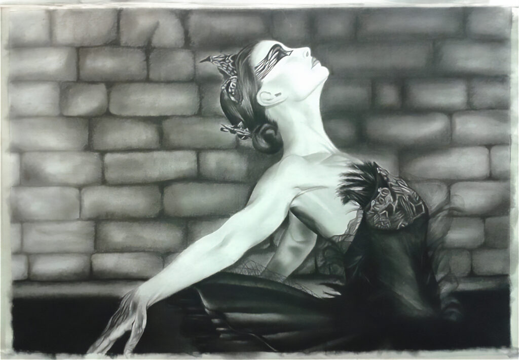 Reproducción de un fotograma de la película The Black Swan (El Cisne Negro). Para De Luis, gran admirador de Darren Aranofsky y Natalie Portman, era casi un deber homenajear esta obra maestra del cine, en la que identifica rasgos de su propia personalidad, como la búsqueda enfermiza del perfeccionismo, la pérdida de noción de lo real frente a lo imaginario o el lado oscuro inherente al ser humano.