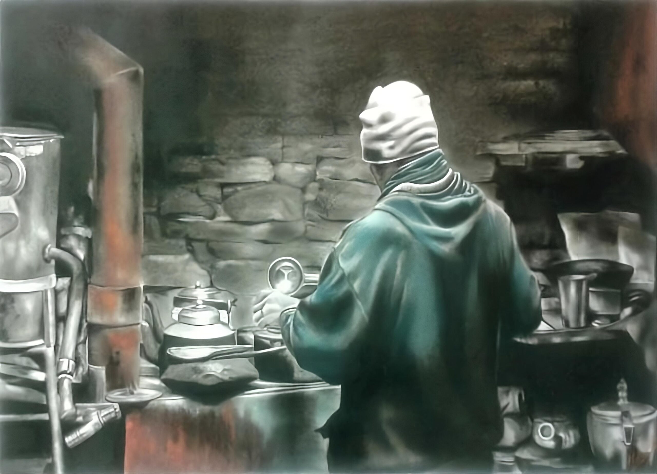 Regalo de bodas. Este trabajo es una reinterpretación de una foto de uno de los novios, realizada en Nepal, justo el día en que se prometió la pareja. La obra trata de plasmar la atmósfera de intimidad y cotidianeidad que me cautivó y que, a su vez, me sirvió de inspiración para el dibujo.