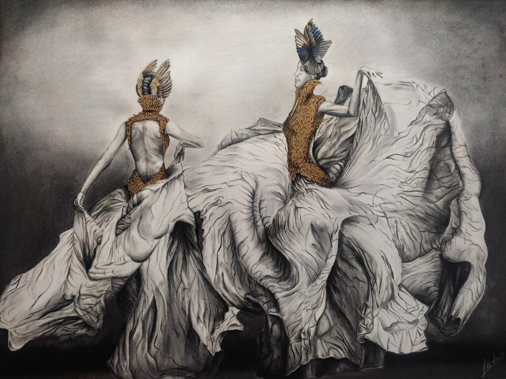En la obra, el autor aplica las tonalidades del plumaje de este ave para los tocados, inspirados en la colección de Las viudas de Culloden, así como en el cuerpo de los trajes. A colación de la transformación a la que hace referencia Irere, De Luis consigue que las bailarinas no parezcan figuras humanas, sino sumidas en un proceso de metamorfosis en pájaro.