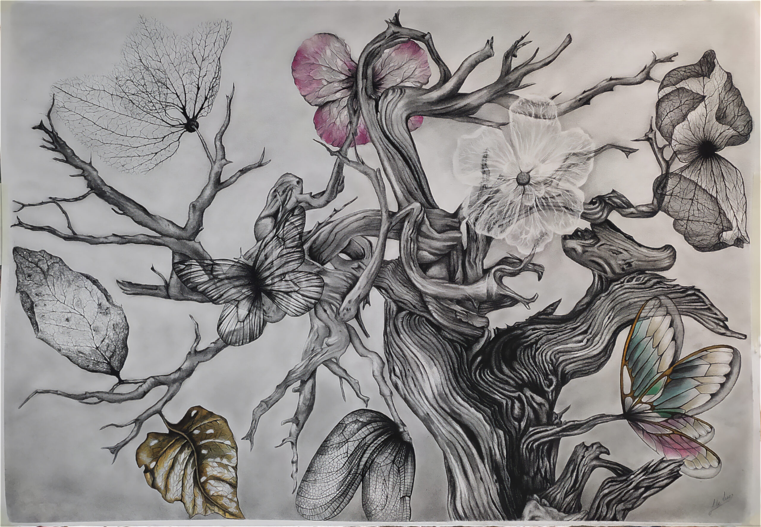 De Luis evoca nuevamente la idea de la muerte en esta obra, que puede interpretarse de manera inversa, como el paso de la vida a la muerte o viceversa. También utiliza elementos ya comunes en sus creaciones, como la mariposa, la polilla y los elementos florales, aunque en forma esquelética esta vez, como la flor esqueleto, que debe su nombre a la transparencia de sus pétalos. En esta representación el autor juega y casi se mofa de la idea convencional del bodegón y las naturalezas muertas.